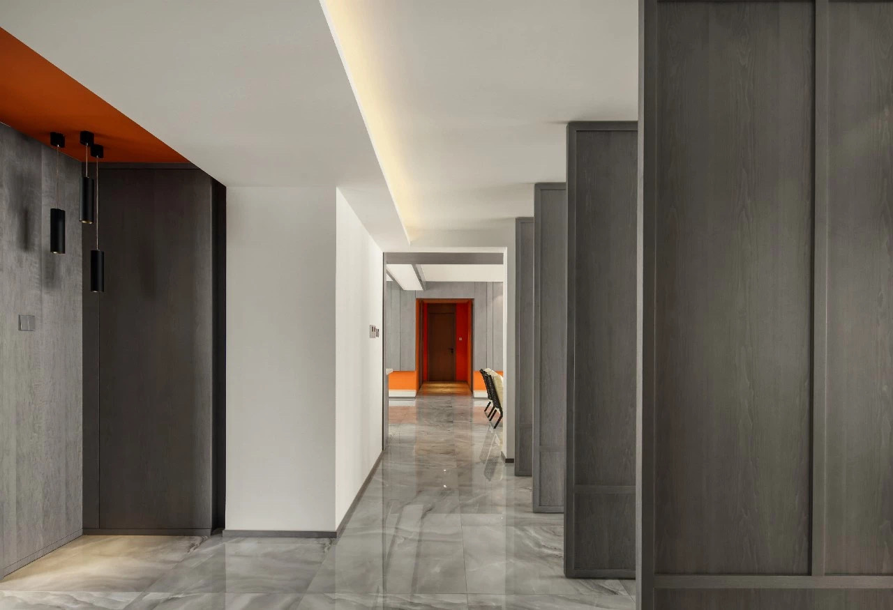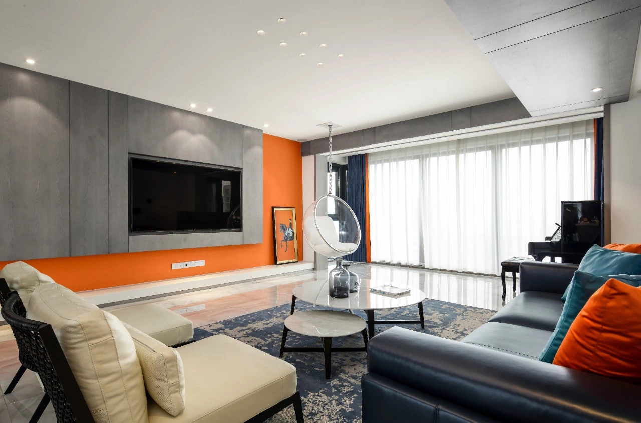 客厅:设计师大胆采用爱马仕橙,营造了一个活力而又温暖的基调。它并不容易被驾驭,唯有不断更新的创意设计才与之相衬。