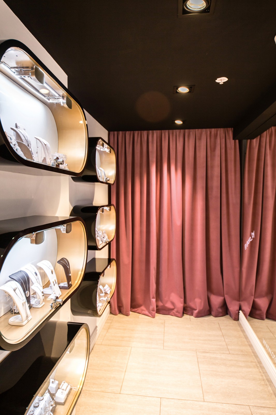 空间里面金色配搭着高级灰色系的窗帘,暖黄色的灯光照在垂坠感极佳的暖色织物上,营造了安逸的观赏购物环境