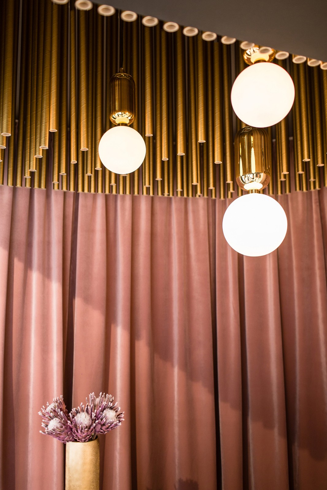 顶面下吊的金色管状装饰品长短不一,与地面桌面的金属装饰产生呼应