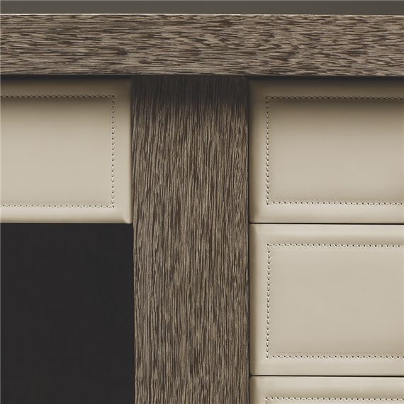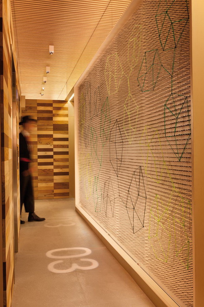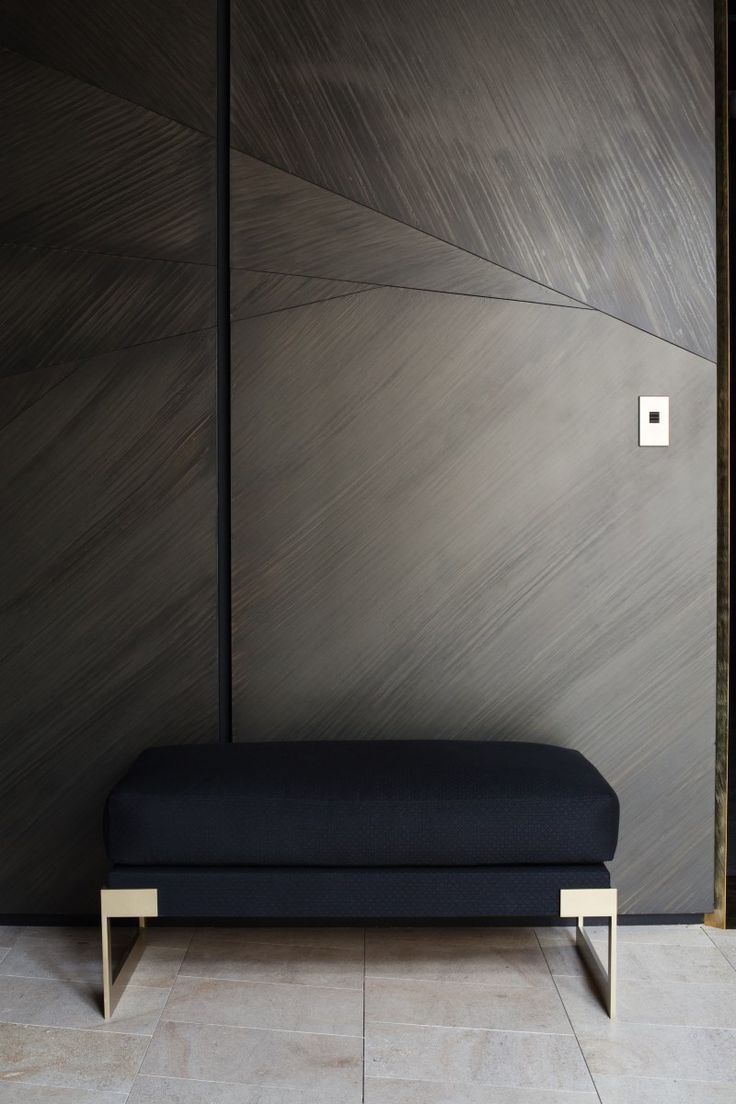 相同纹理的木纹板被不同的拼接角度整合在一张柜门板上,在视觉上造成了消失点效应,板上金属的开关套和地板上的座椅底饰为同一材质,让本来没有关联的空间有了共通点。