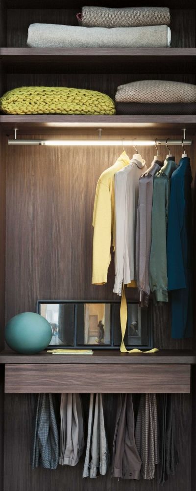 原本只是一个普通的分层衣柜,冷色的木板也毫无出挑可言,却被金黄色的灯光硬生生拉出了一个比不一样的境界,配合中性色系的柔软衣物,反而在这个冷冰冰的衣柜中营造出一种温暖安心的感觉。